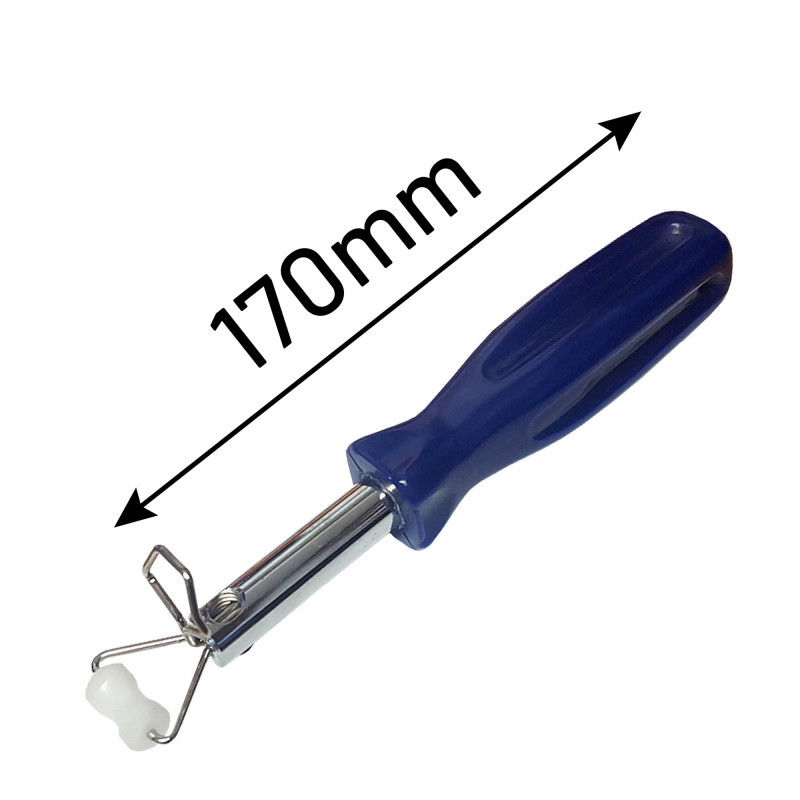 Wanneer de situatie het vereist om wat dichter met de pezentrekker op het raamrubber te werken is deze korte versie een uitkomst. Deze korte pezentrekker met roloogje is juist gemaakt voor een vloeiende montage van het glas in het raamrubber i.c.m. een pees.