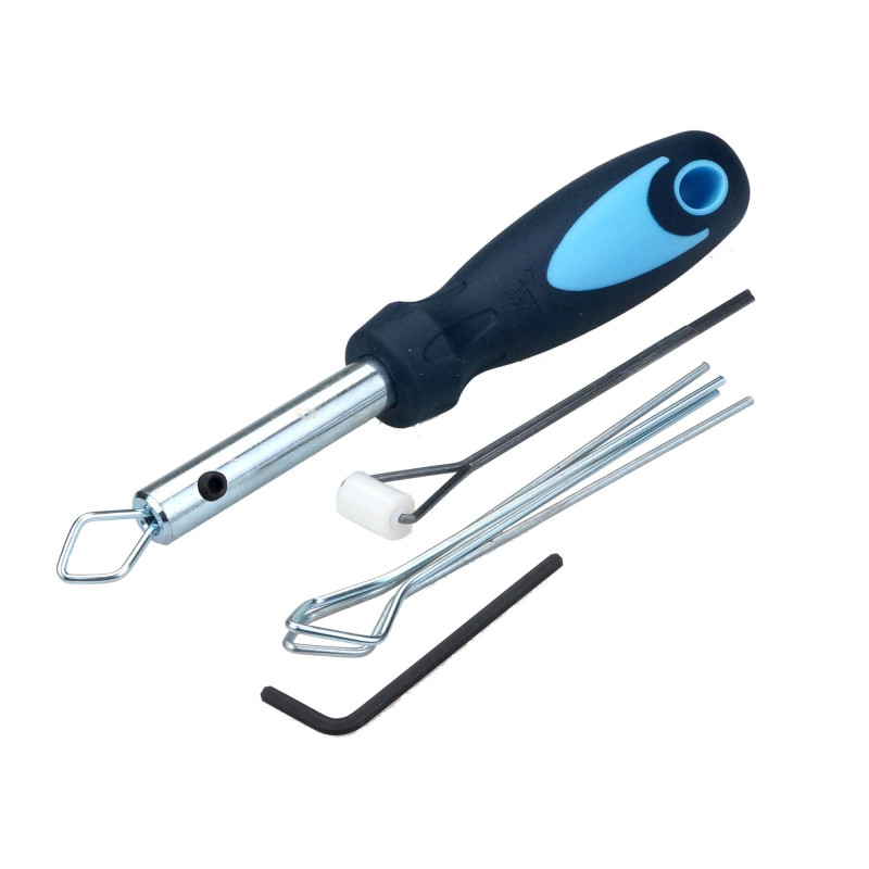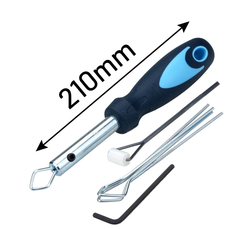 Deze pezentrekker met roloogje en 5-verschillende losse oogjes biedt een bereik aan maten welk veel voorkomende zijn bij raamrubbers die met pezen werken.