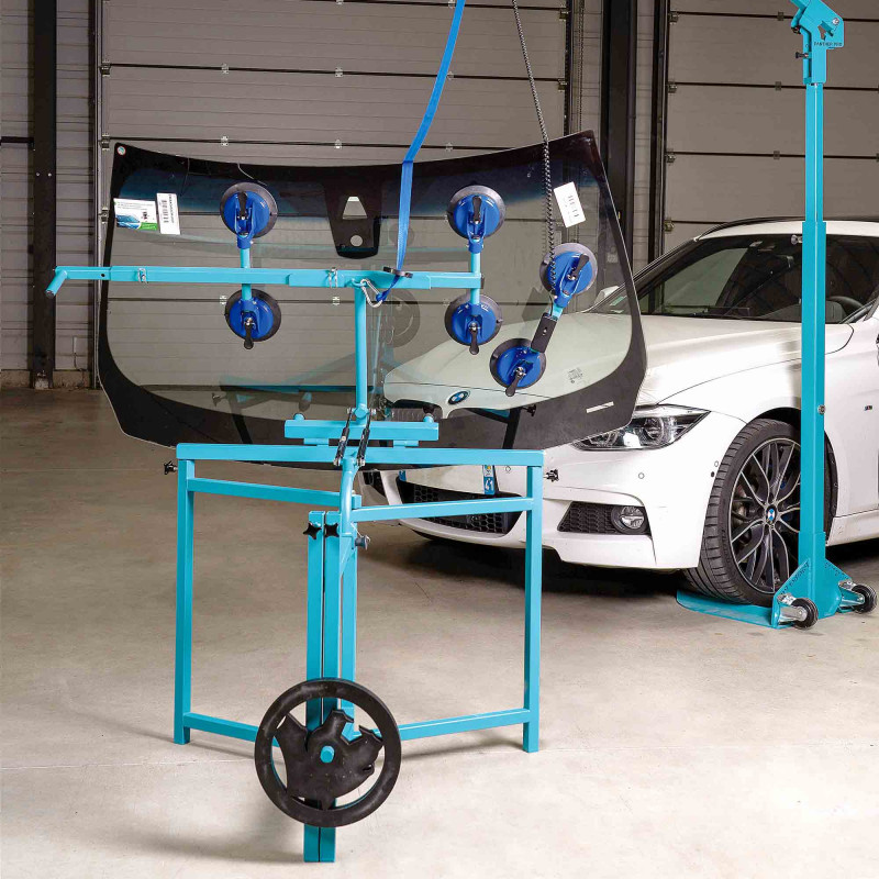 - Horizontale stand – om de ruit vlak neer te leggen voor werkzaamheden aan de binnenzijde, zoals reinigen, lijmvoorbereiding of sensormontage.
