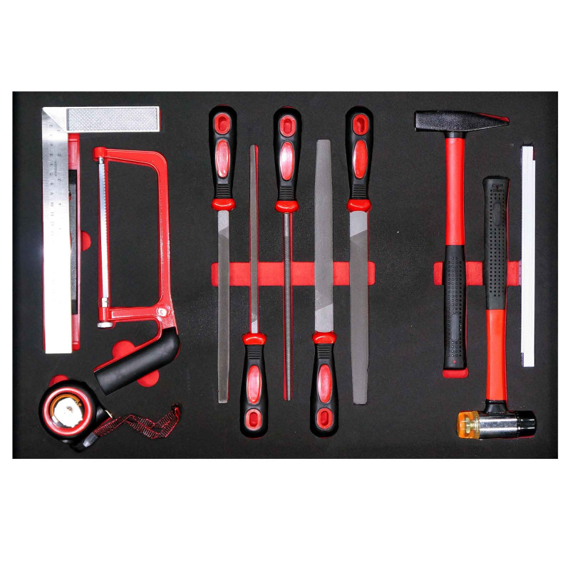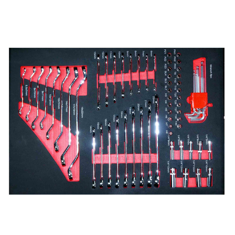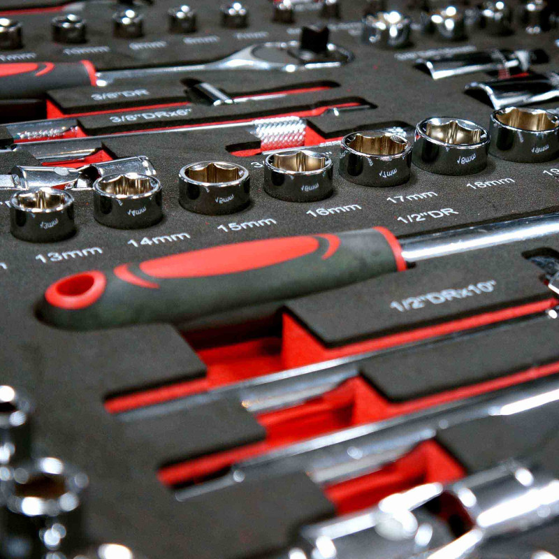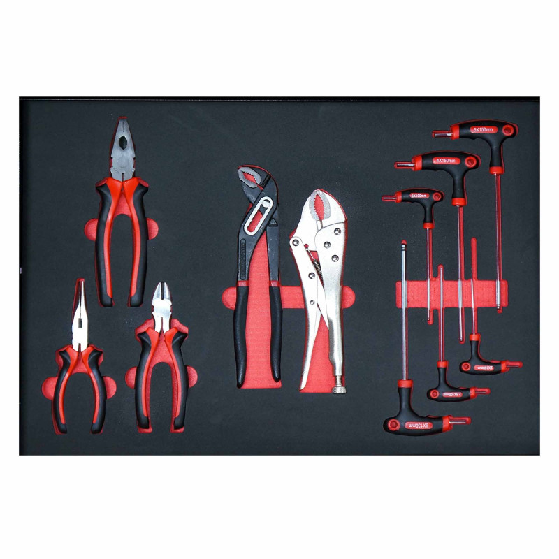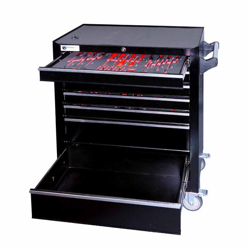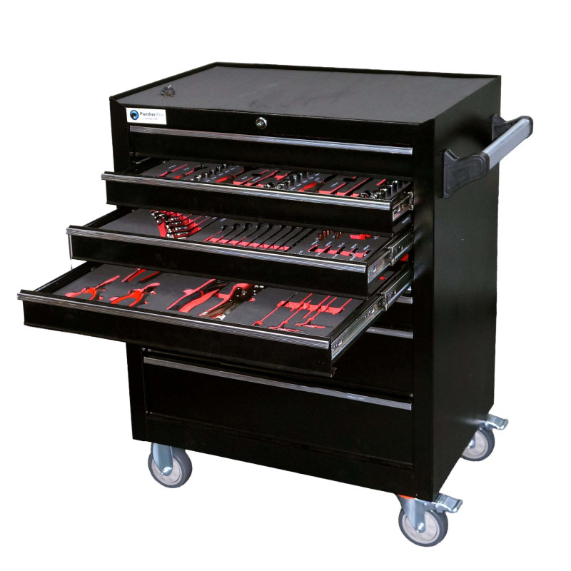 De gereedschappen zijn georganiseerd in foam-inlays, waardoor elk onderdeel overzichtelijk op zijn plek blijft en direct vindbaar is. De gereedschapswagen is bovendien voorzien van een centrale vergrendeling, zodat inhoud en lades met één handeling kunnen worden afgesloten.