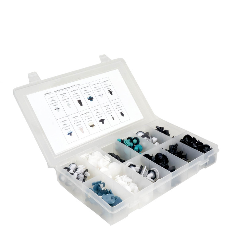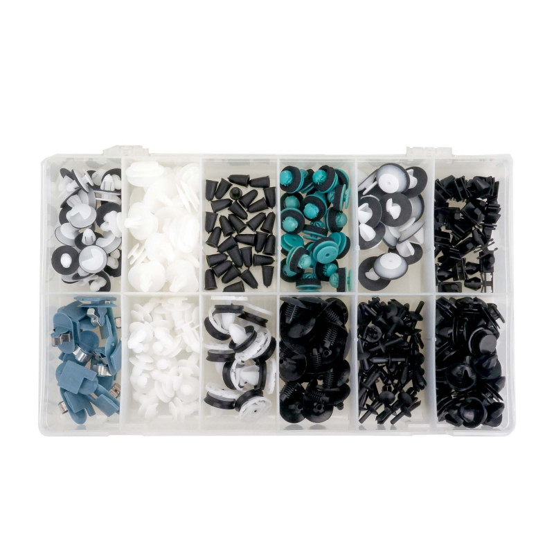 Deze assortimentsdoos bevat 150 veelgebruikte bevestigingsclips passend voor Renault-voertuigen. De set is samengesteld met de meest voorkomende types clips voor panelen, deurlijsten, logo’s.