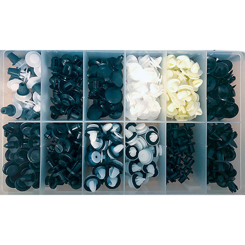 Deze uitgebreide assortimentsdoos bevat 295 veelgebruikte bevestigingsclips voor PSA-voertuigen (Peugeot en Citroën). De set omvat een breed scala aan paneelclips, sierlijstclips en pluggen die geschikt zijn voor carrosserie- en interieurmontage.
