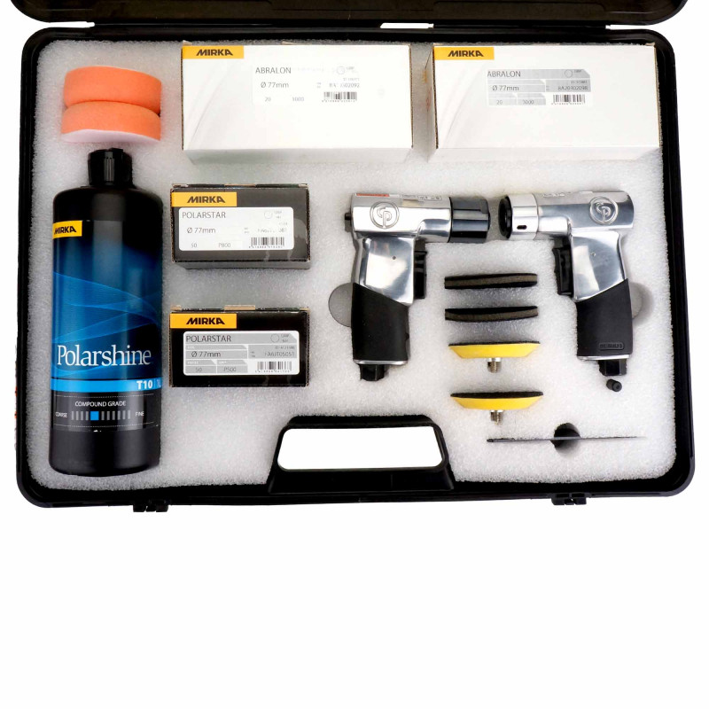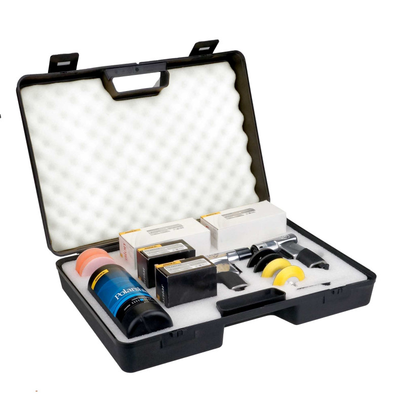Complete set voor restauratie en polijstwerk aan koplampen inclusief schuurpapieren, polijstschijf, schuimsponzen en pneumatische polijstmachines