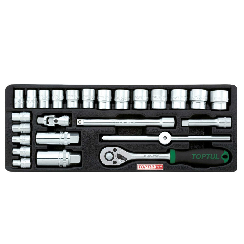 Deze complete 25-delige 3/8″ Flank Socket Set van Toptul is een professionele en veelzijdige set doppen en accessoires voor gebruik met 3/8″ ratels.