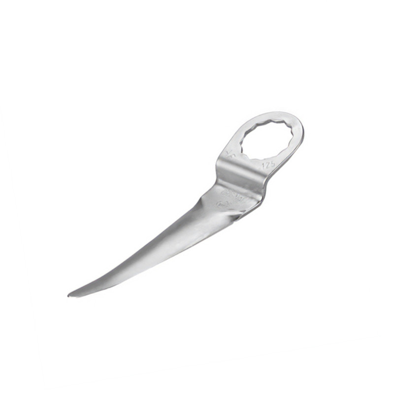 Fein mes die in combinatie met de oscillerende bewegingen van een Fein machine, de polyurethaanlijm bij verlijmde ruiten doorsnijdt.