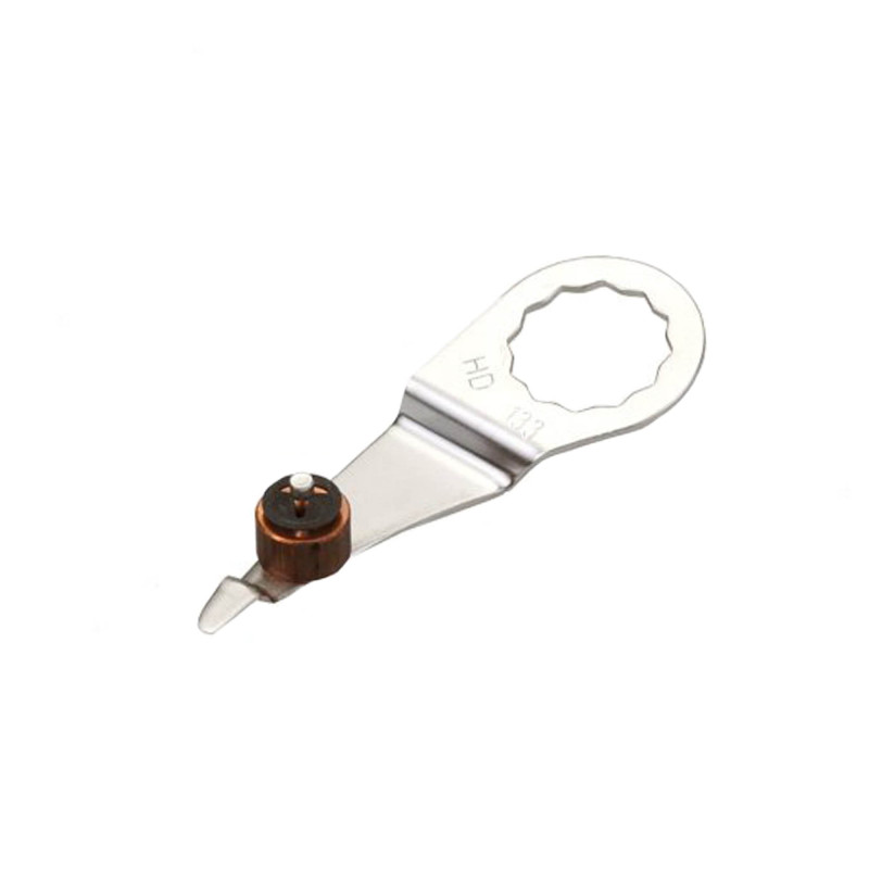 Fein mes die in combinatie met de oscillerende bewegingen van een Fein machine, de polyurethaanlijm bij verlijmde ruiten doorsnijdt.