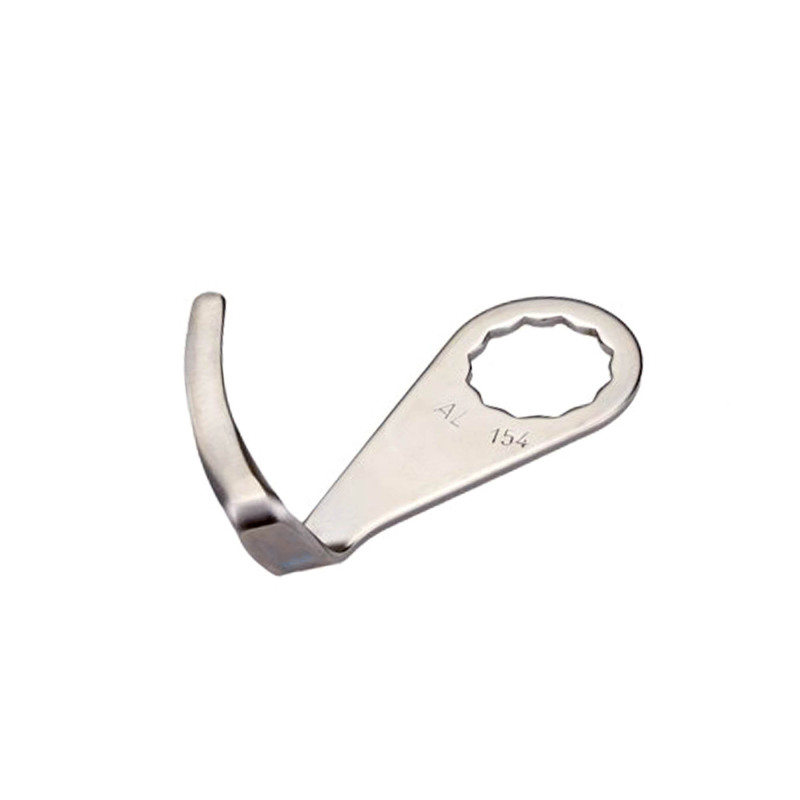 Fein mes die in combinatie met de oscillerende bewegingen van een Fein machine, de polyurethaanlijm bij verlijmde ruiten doorsnijdt.