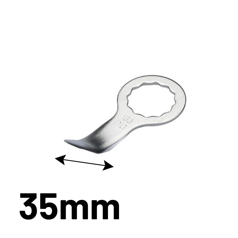 Fein mes die in combinatie met de oscillerende bewegingen van een Fein machine, de polyurethaanlijm bij verlijmde ruiten doorsnijdt.